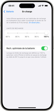 Sur les modèles plus anciens, cette fonction se trouve dans Réglages > Batterie > État de la batterie et recharge. Ici, vous pouvez l’activer ou la désactiver facilement. Si vous la désactivez, la batterie risque de s’user plus rapidement et sa durée de vie peut en être réduite.